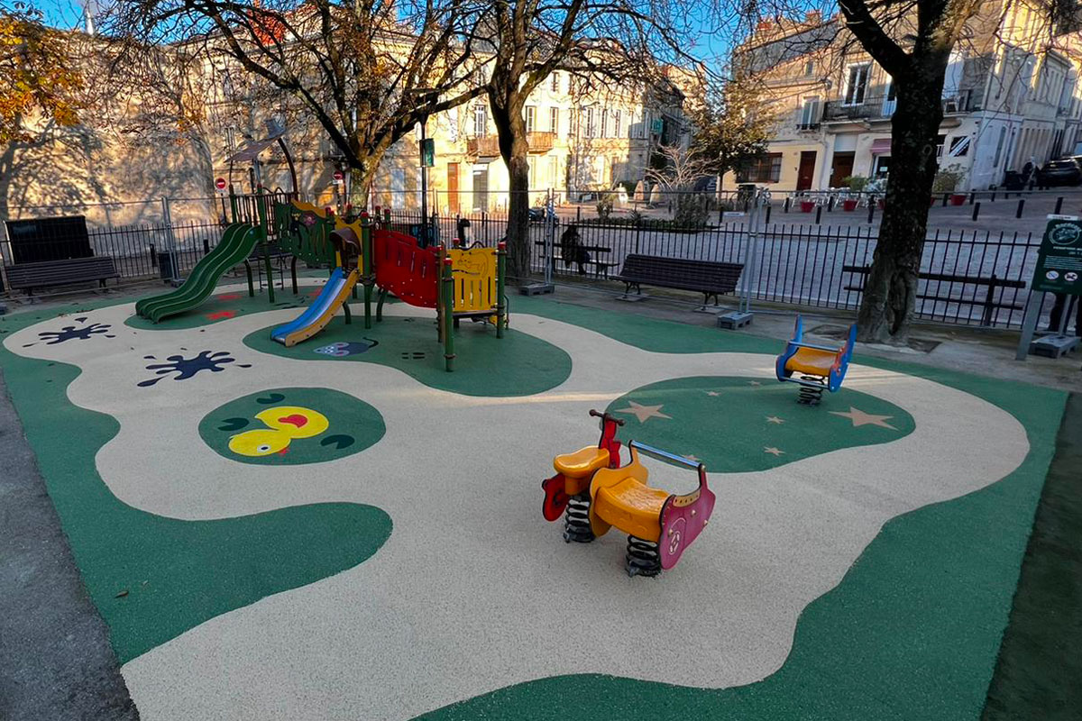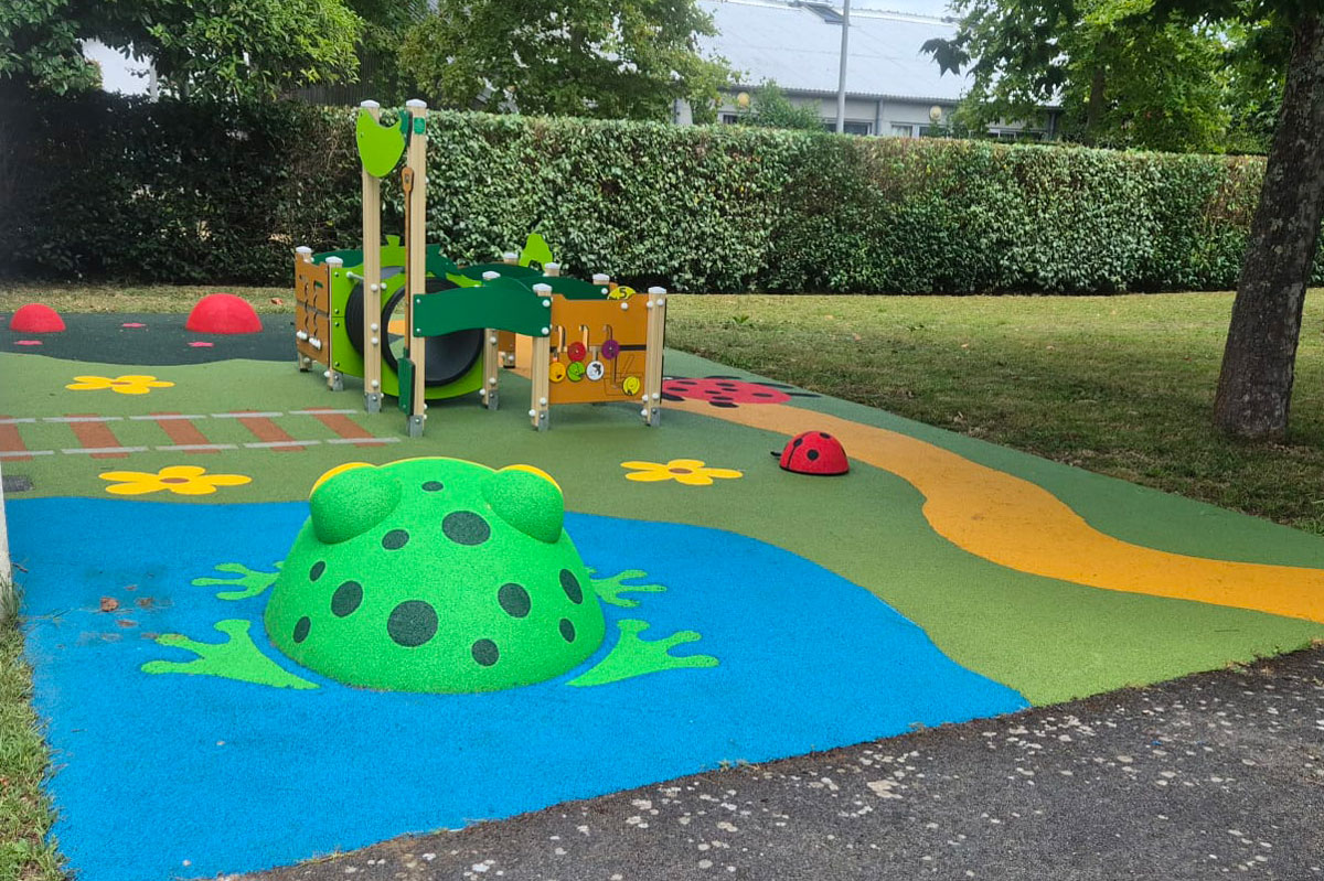 Sol coulé en EPDM, liège, gazon naturel ou synthétique, sable, gravillons roulés, copeaux de bois, dalle EPDM ou alvéolées : chaque solution est choisie selon les exigences du site, les usages attendus, les normes en vigueur et les préférences esthétiques de la collectivité.